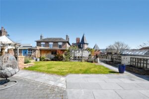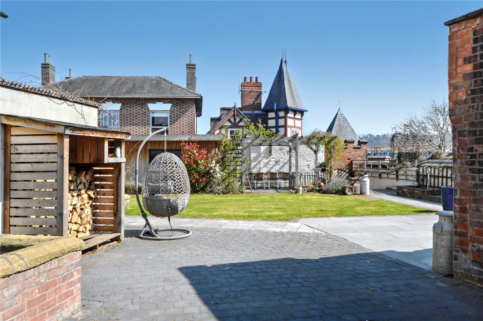 Externally, the property offers a superb family friendly garden which provides an excellent space for entertaining and a practical area for children to play. A large paved patio terrace steps out from the rear of the property and continues to a level lawn with raised flower beds and paved pathways. A versatile garden room is positioned to an excellent bbq area with pergola. There are useful stores/ sheds. Another particular feature is gated access directly onto the historic Castle Walk.