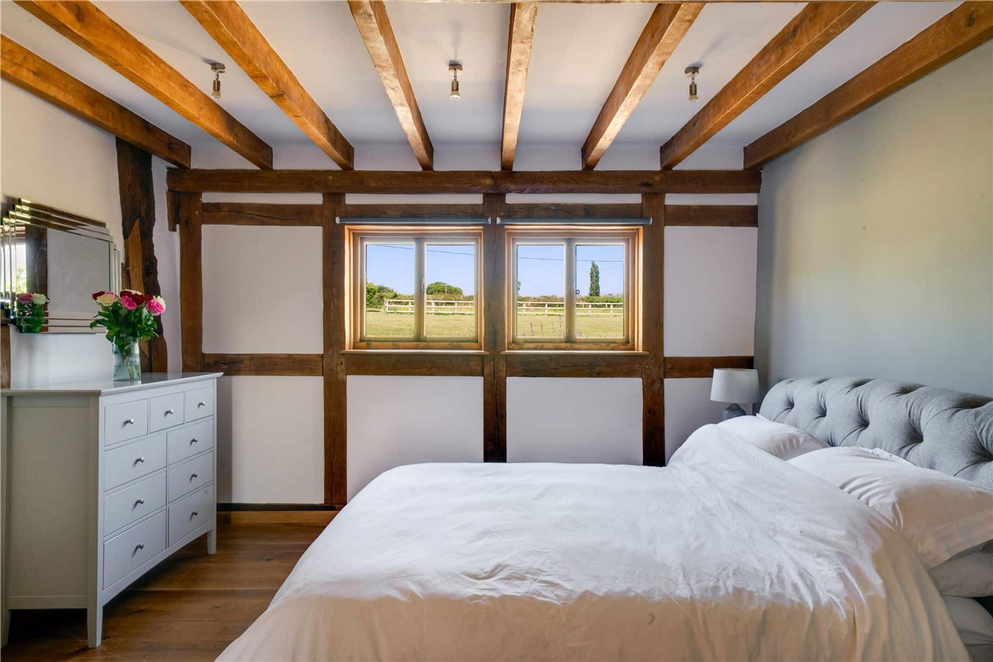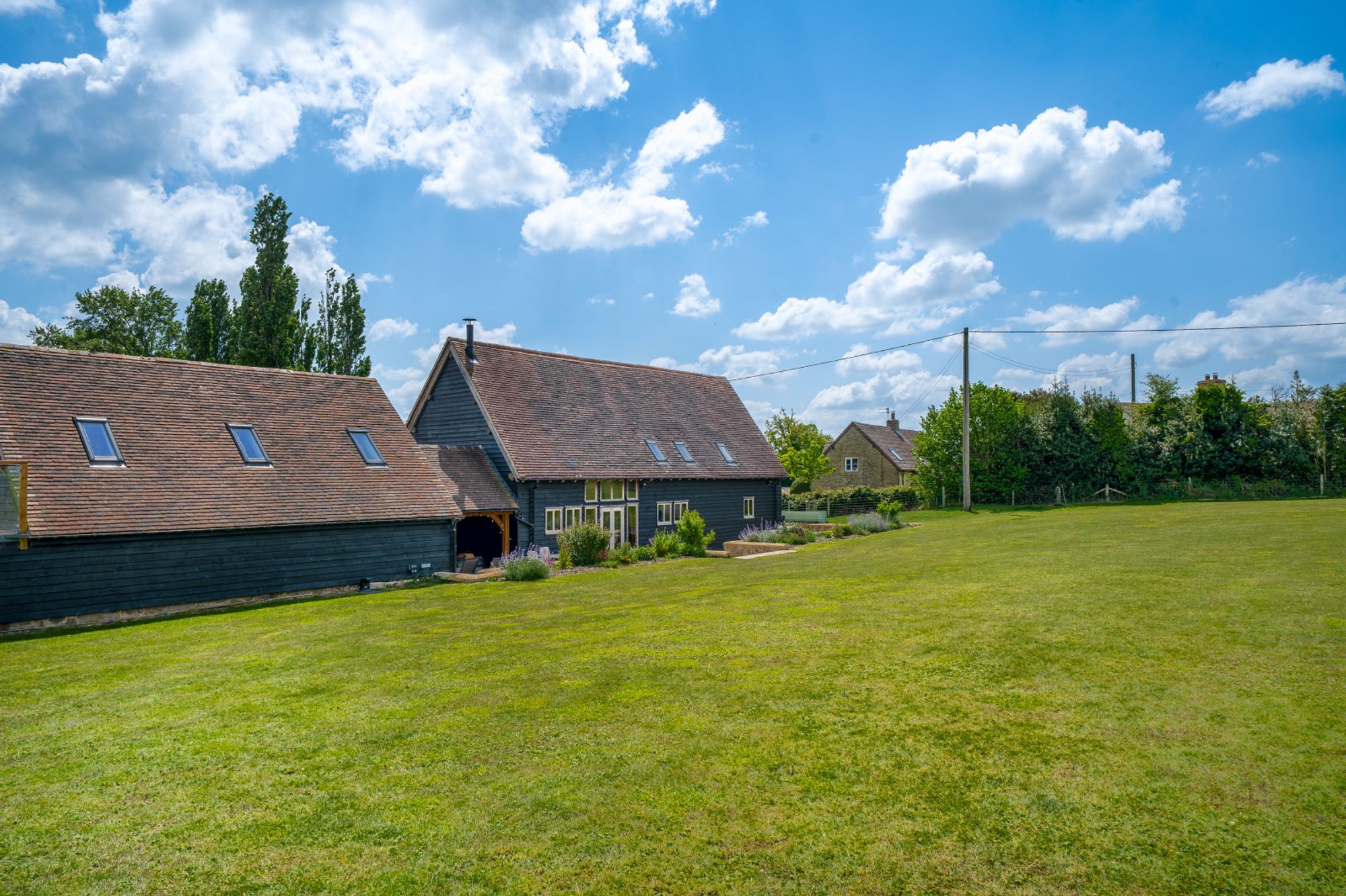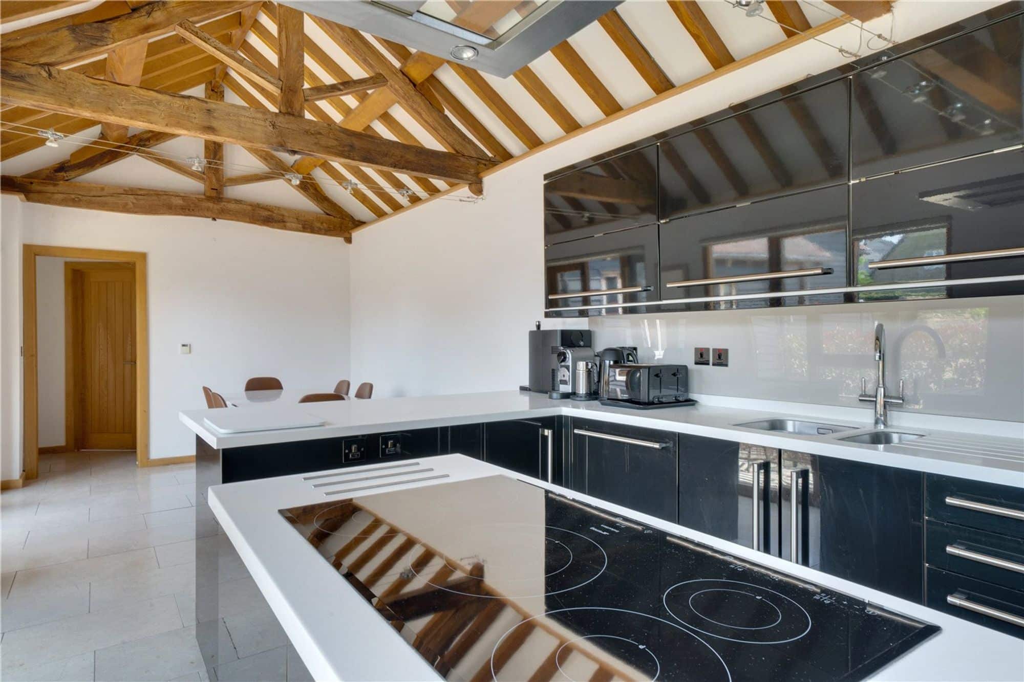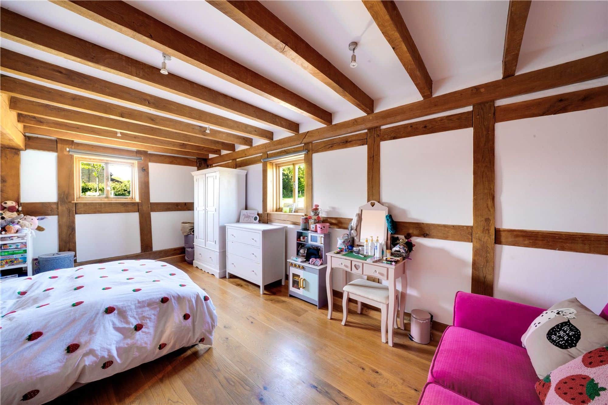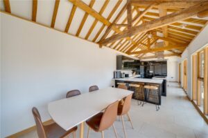 The main house is beautifully appointed with character features throughout including exposed timbers, vaulted ceilings, and oak flooring. The layout is thoughtfully designed for family living, complemented by stylish interiors and high-end finishes.