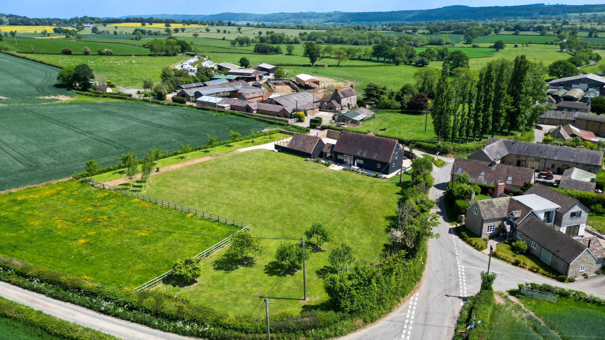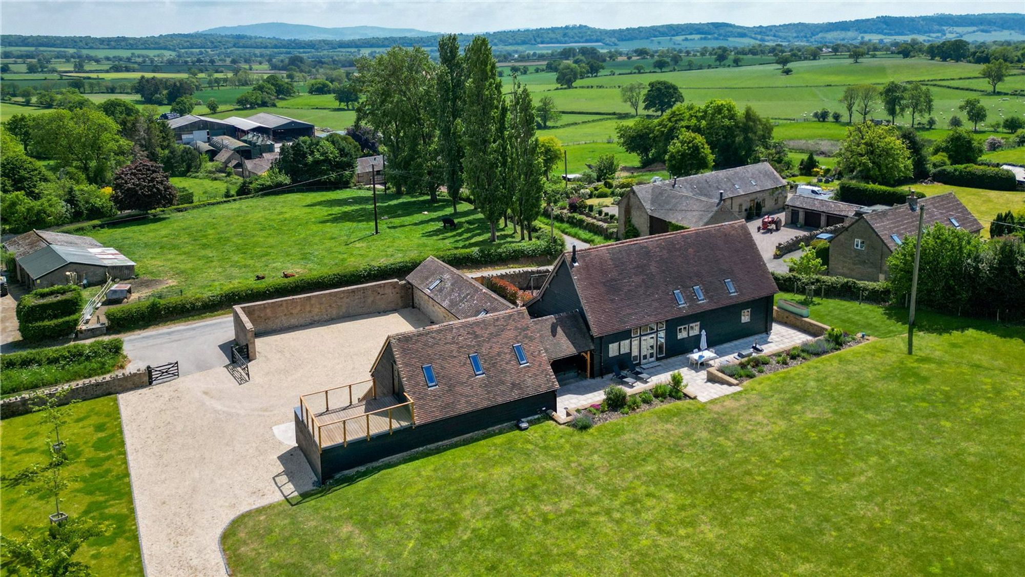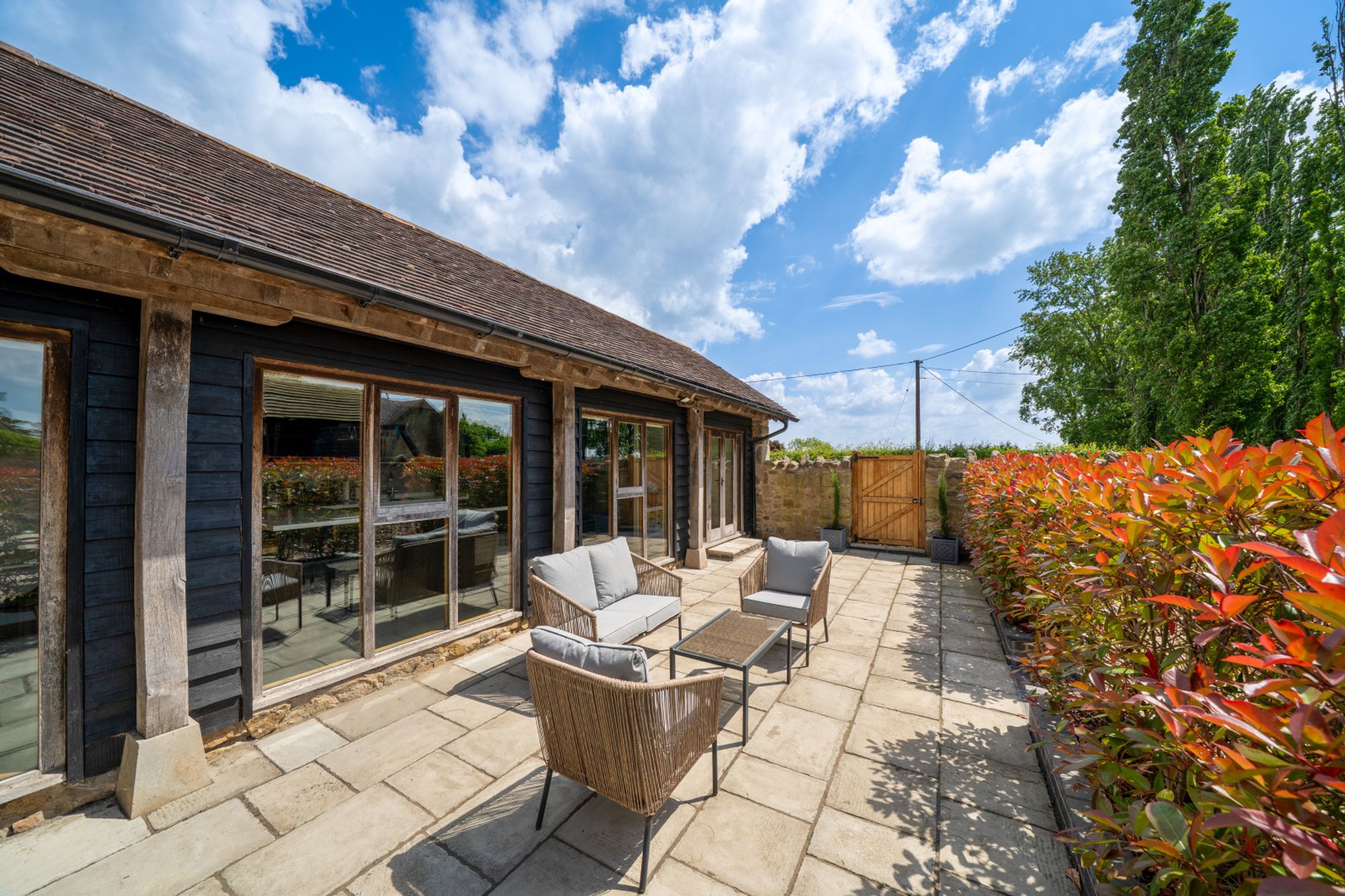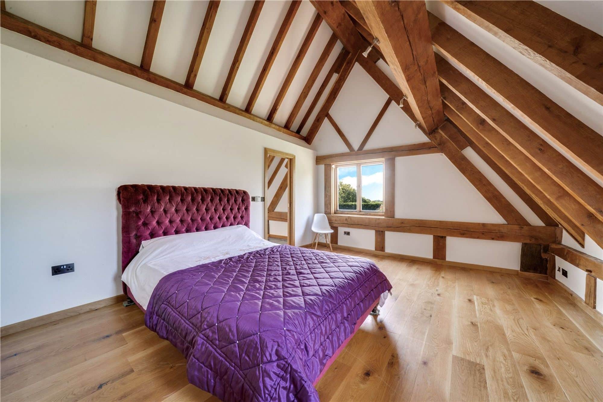 The main house is beautifully appointed with character features throughout including exposed timbers, vaulted ceilings, and oak flooring. The layout is thoughtfully designed for family living, complemented by stylish interiors and high-end finishes.