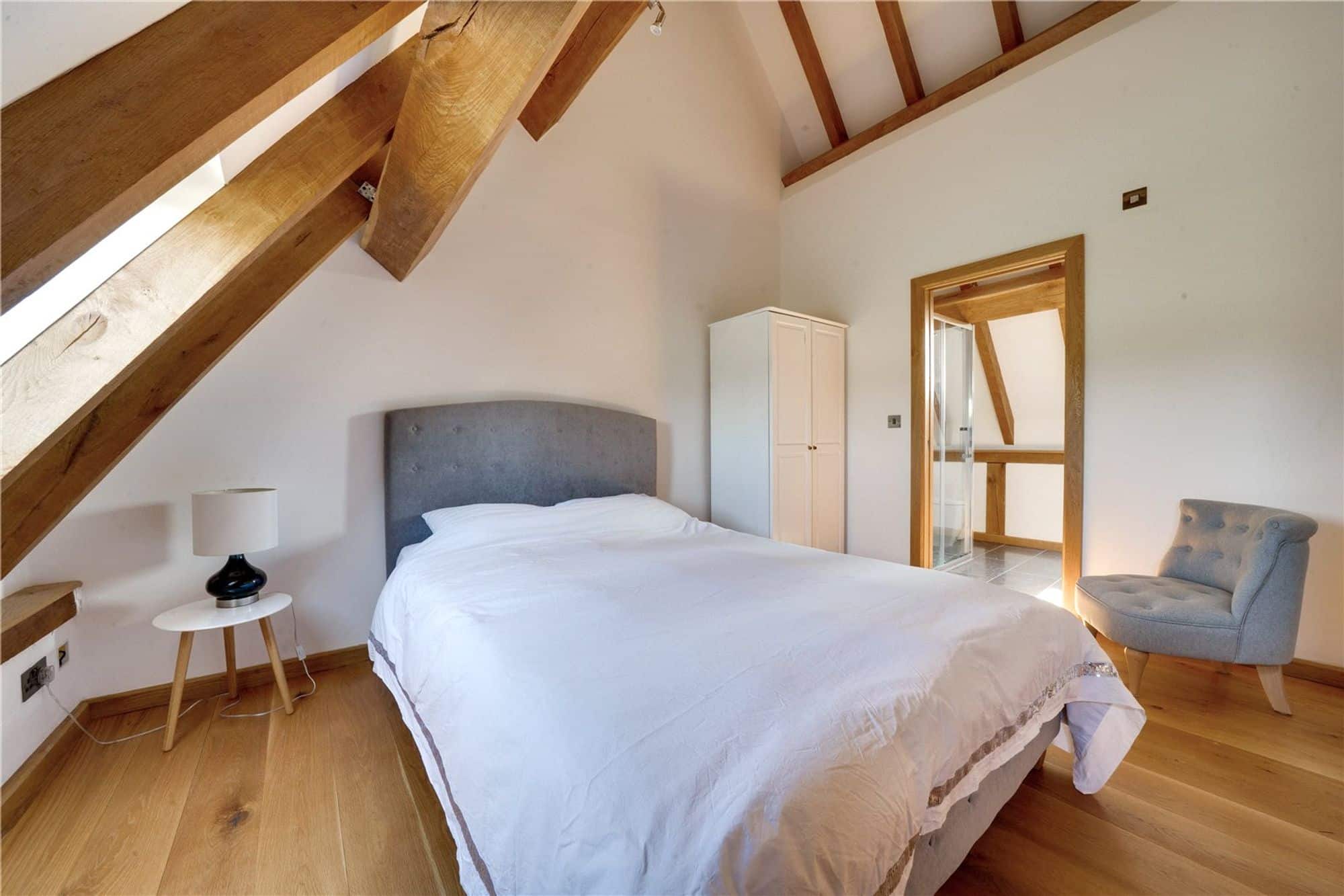 Upstairs there are two spacious bedroom suites, each enjoying the benefit of en suite shower rooms. The principal bedroom boasts character beams, vaulted ceiling and countryside views. The second bedroom also benefits from character beams and a light, peaceful atmosphere.