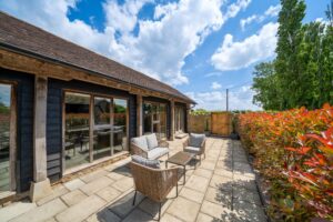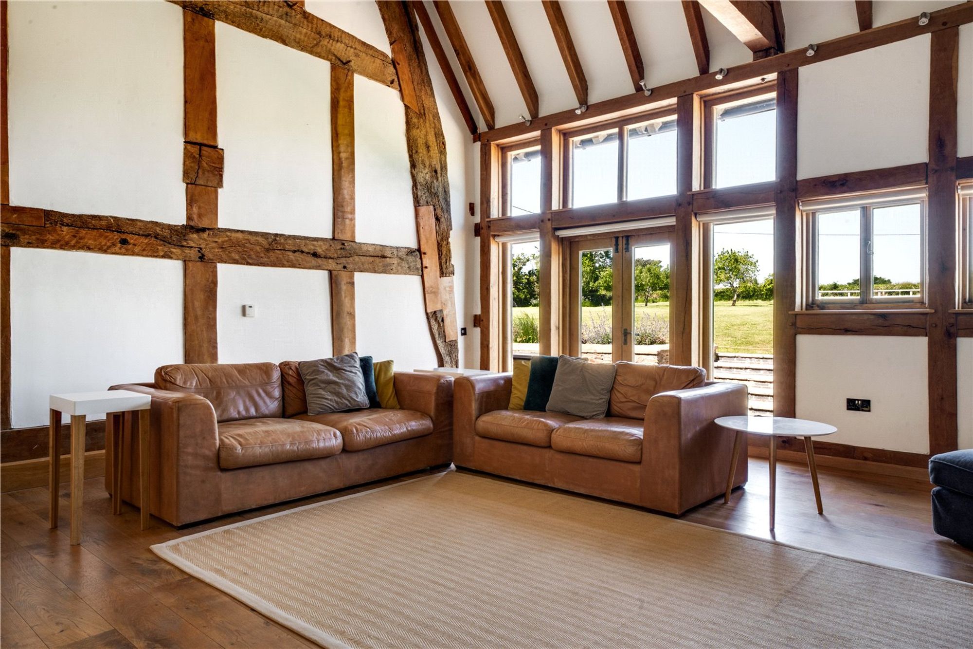 The real heart of the home is the open-plan kitchen/breakfast room. There are superb features including a vaulted ceiling with exposed beams and trusses and ample natural light coming in from the three sets of full height timber-framed windows, including one set of double doors opening out onto the patio area beyond.