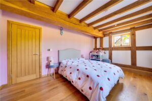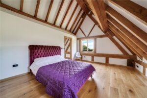 Located just off the kitchen is a reception room, which is currently used as a snug, with double doors opening out onto the patio area. The living room is a magnificent space, with character beams, an impressive vaulted ceiling and a wall of windows framing the countryside views. Double doors open out from here to the garden. A suspended wood-burning stove set on a stone plinth creates a striking focal point and enhances the room’s warm, rustic character.