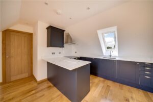 The kitchen/living area has been fitted with sleek navy shaker-style cabinetry, marble worktops and integrated appliances. A breakfast bar area provides additional workspace and casual dining options, with space for stools beneath. The generously sized double bedroom features wooden flooring and a feature wall of painted panelling. Dual aspect windows ensure the space is filled with natural light. The ensuite shower room is fitted with a large walk-in shower, wash basin and WC.