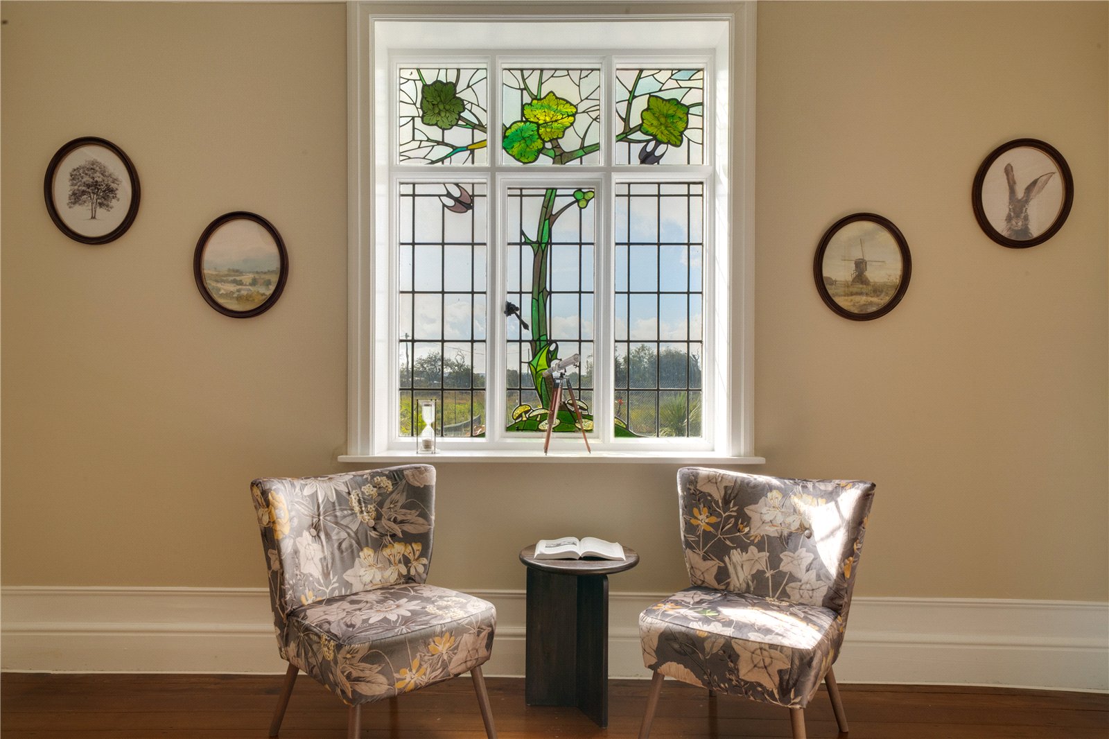 Step into the grand entrance hall, where original features such as the traditional staircase and a striking stained-glass window are complemented by elegant modern décor. Practicality meets style in the utility and boot room, complete with laundry facilities and a WC, ideal for drying dogs and storing walking gear after a day outdoors.