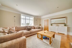 A separate dining room offers a spectacular setting for entertaining, with an enormous dining table, dedicated bar area, twin bottle fridges, and a wine chiller—perfect for celebratory feasts. The light-filled lounge provides garden views and doubles as a cinema room, complete with projector, drop-down screen, and an electric fire for cosy evenings.