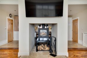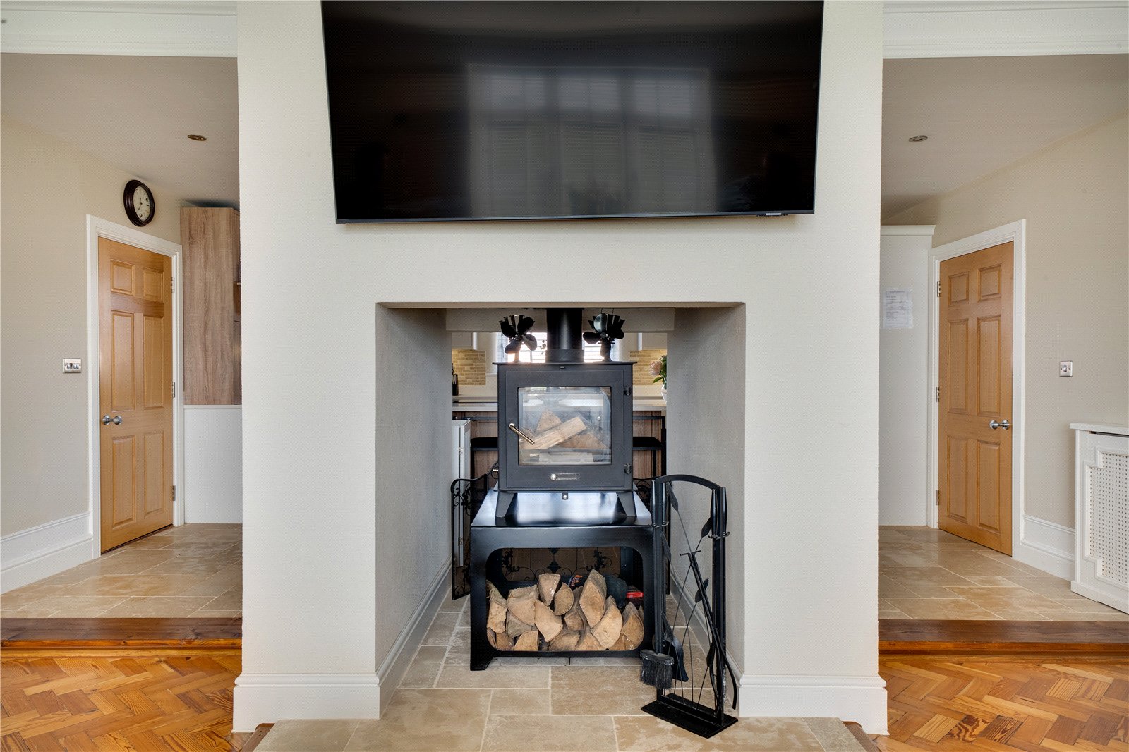 The heart of the home is the show-stopping kitchen, equipped with premium appliances and a sociable island seating six. A partially open-plan layout links seamlessly to the cosy snug, with a long sofa, Smart TV, and a raised wood burner that also warms the kitchen.
