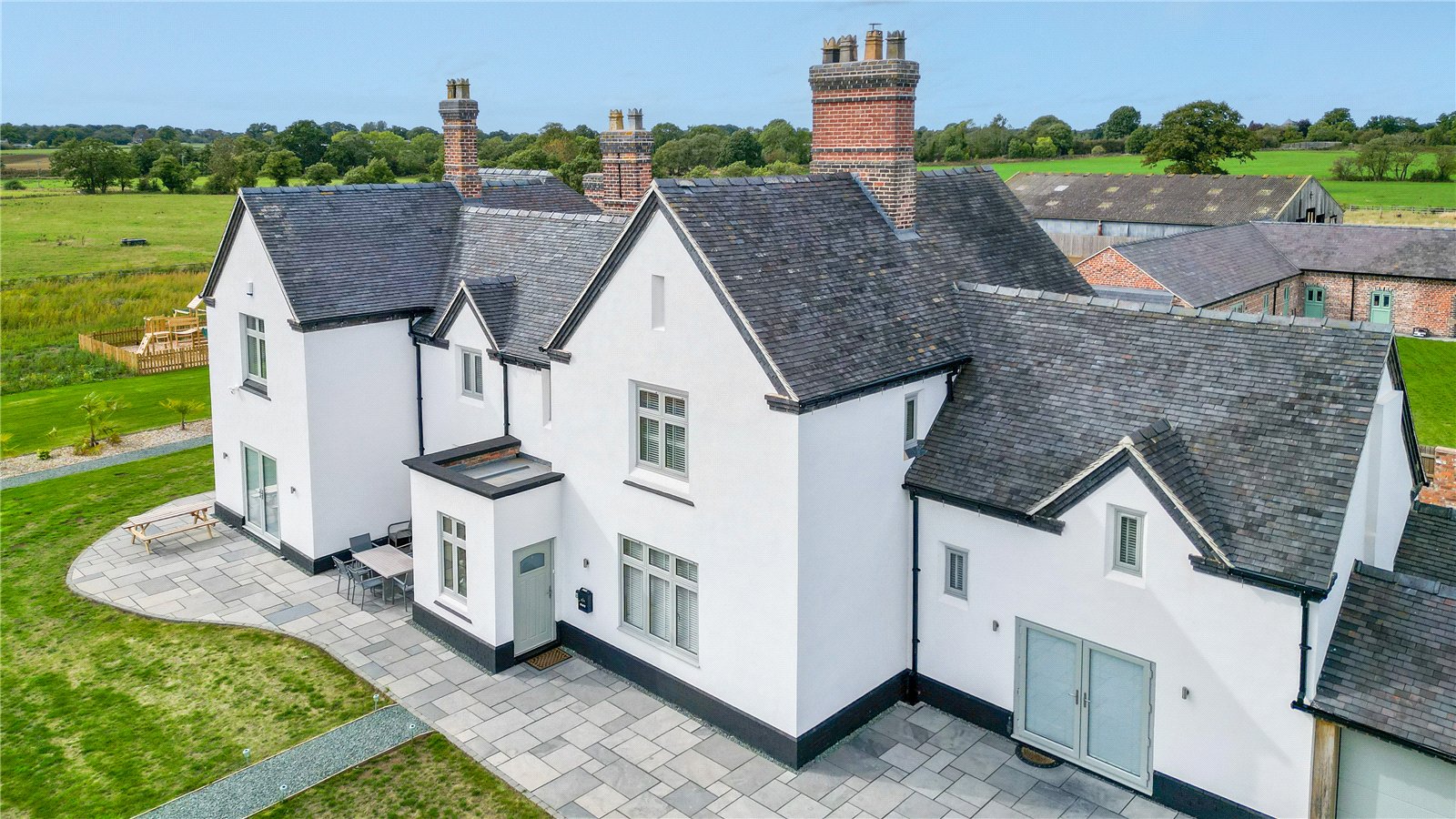 This exceptional seven bedroom country residence, located just north of Shrewsbury, occupies approx 5 acres in a beautiful rural setting in the highly desirable county of Shropshire. The property has undergone an extensive and thoughtful renovation, resulting in an impressive home with striking white render, which perfectly contrasts against the new roof and sits proudly at the end of the long, private drive.