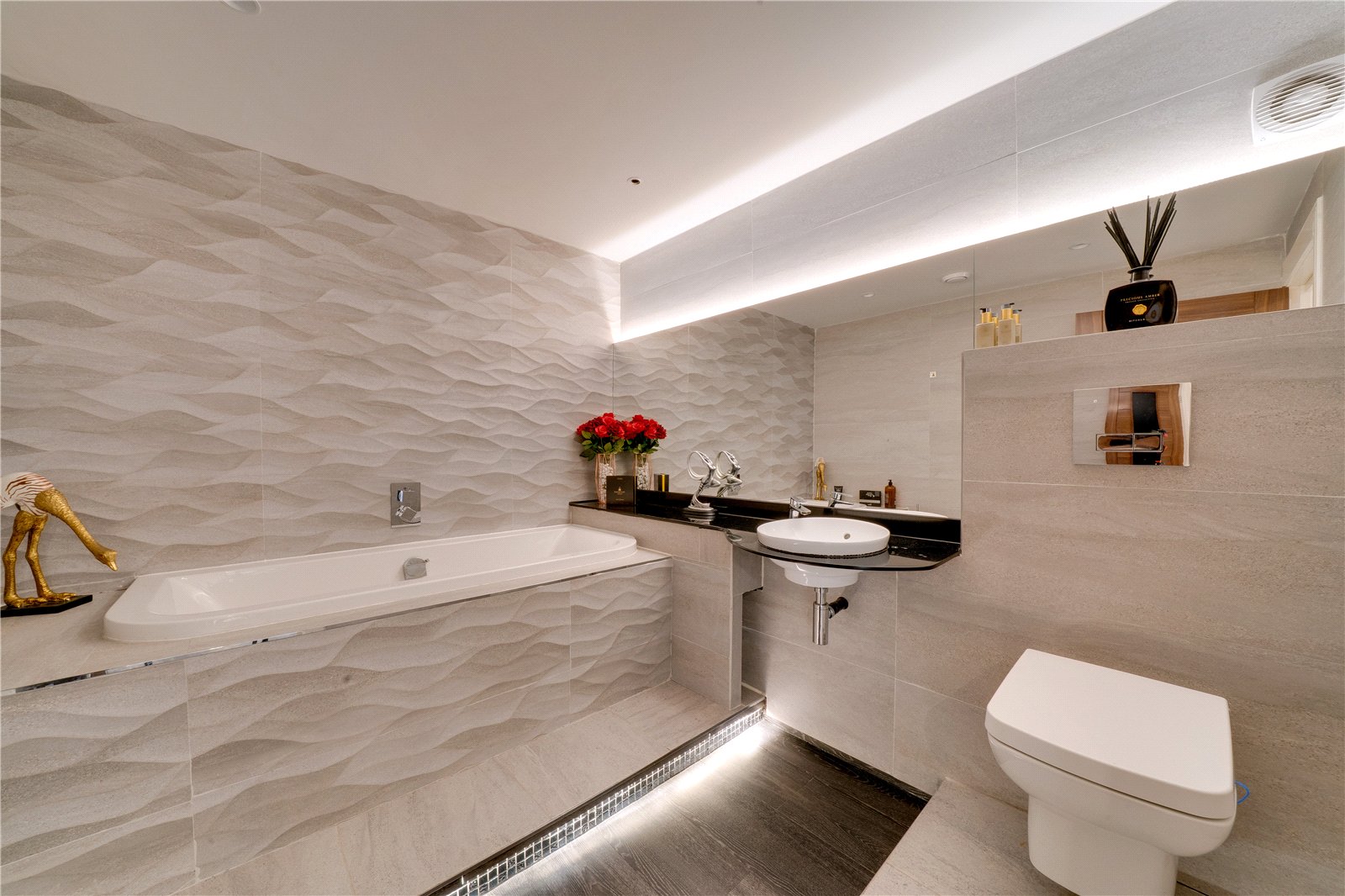 Descending from the main living space, the lower ground floor reveals two further well-proportioned bedrooms, a stunning second bathroom of Porcelanosa distinction, and a useful utility room, all enhanced by automatic ambient lighting and practical design.