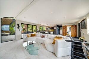 At the centre lies the magnificent open-plan living, dining, and kitchen space. Designed for both sociability and refinement, this light-filled area is bathed in sunshine through floor-to-ceiling acoustic windows and expansive bi-fold doors that open seamlessly onto a grand terrace with covered seating – an all-season haven for entertaining. The kitchen is a showcase of culinary luxury, boasting solid marble worktops and splashbacks, a “Billi” instant boiling water tap, premium integrated “Miele” appliances, and a “Samsung” smart fridge – every detail carefully curated to balance beauty with performance.