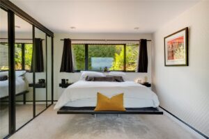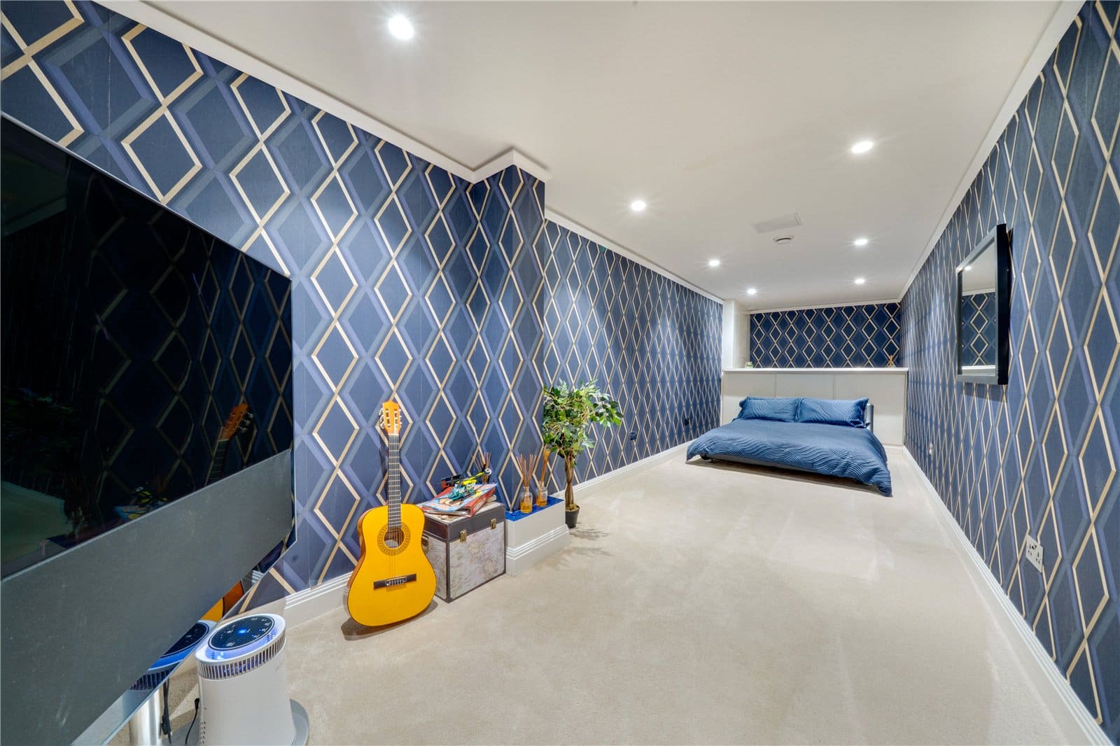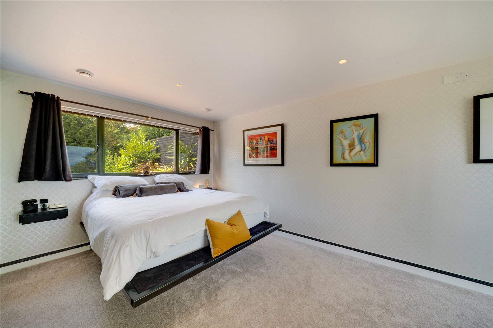 The ground floor principal bedroom offers a serene retreat with dual-aspect views, fitted wardrobes, and a bespoke floating bed designed to maximise the panoramic outlook. A retractable wall-mounted television system adds further indulgence. The adjoining bathroom is a spa-like sanctuary, finished in marble and appointed with Geberit fittings, including a freestanding bath with built-in smart TV and a sleek walk-in shower.